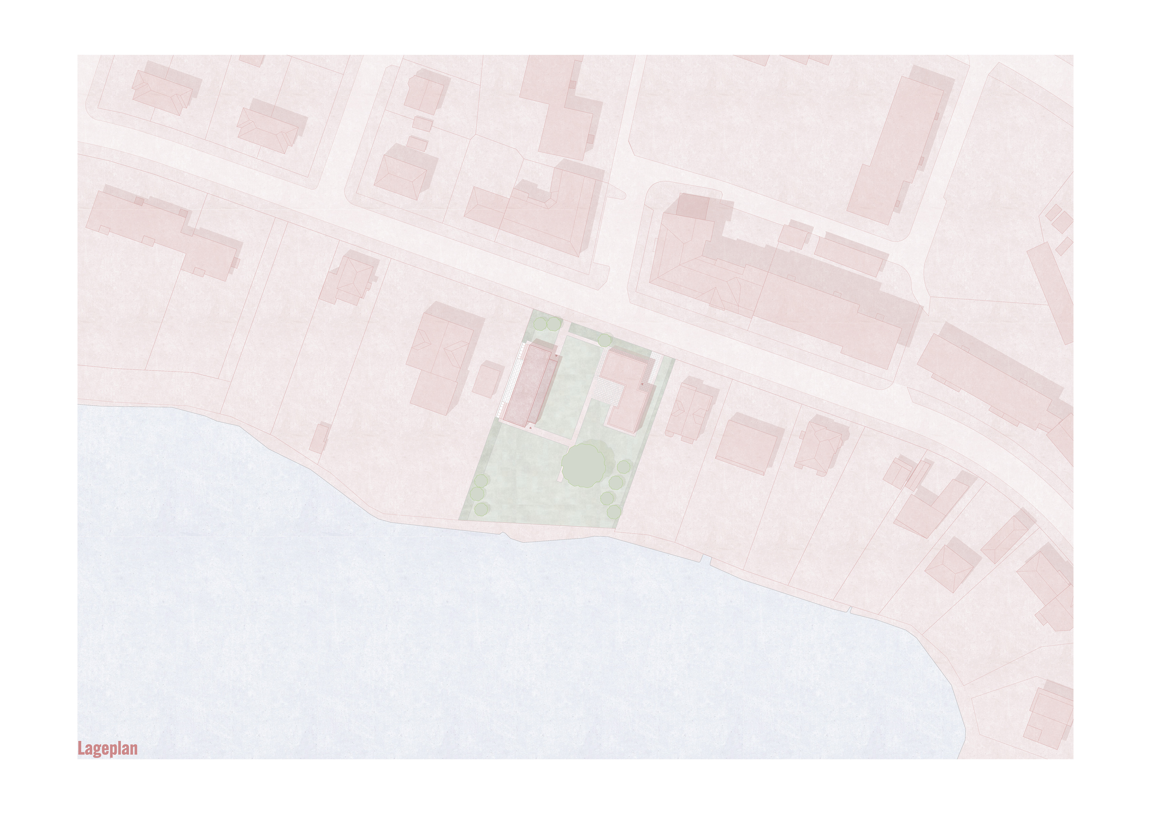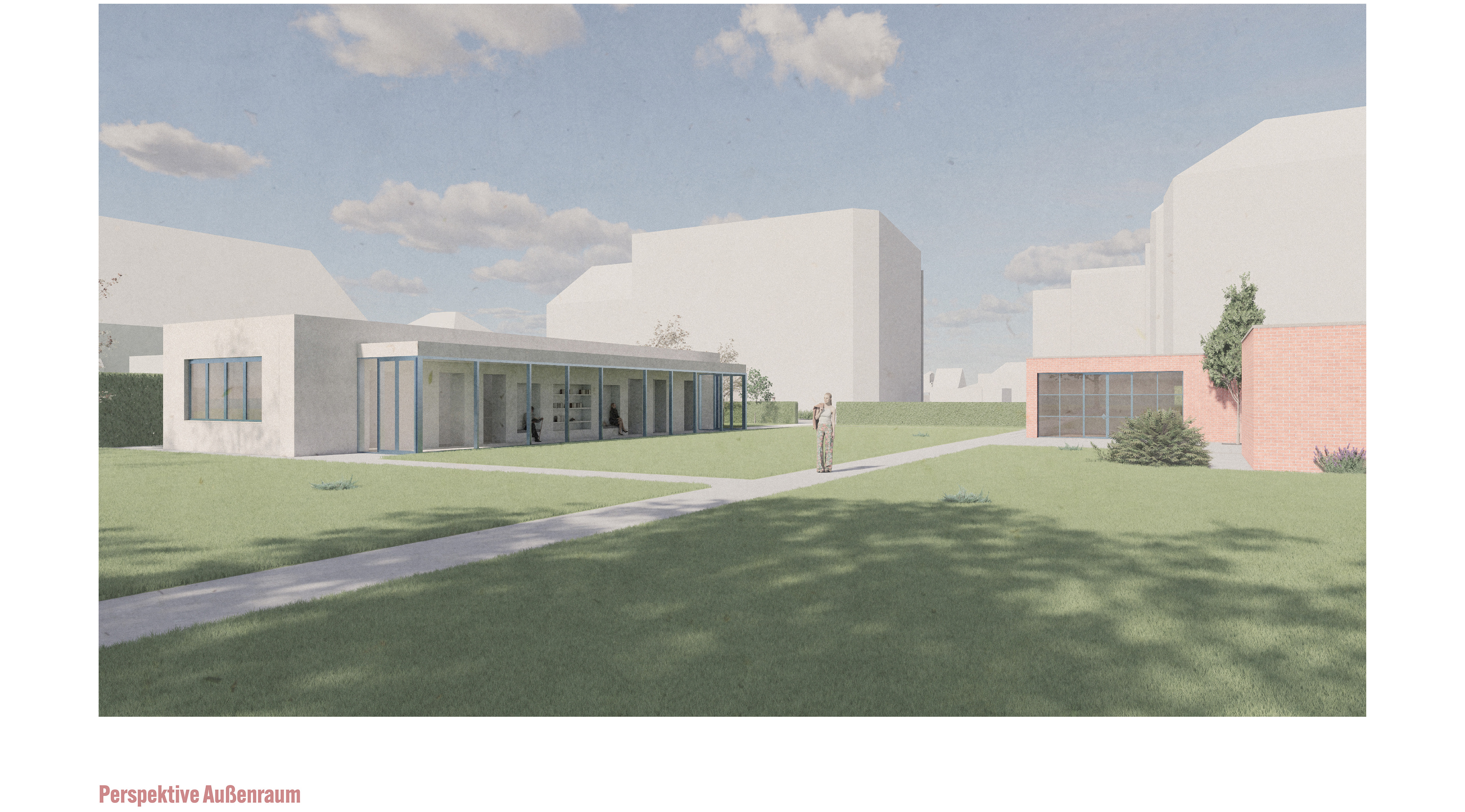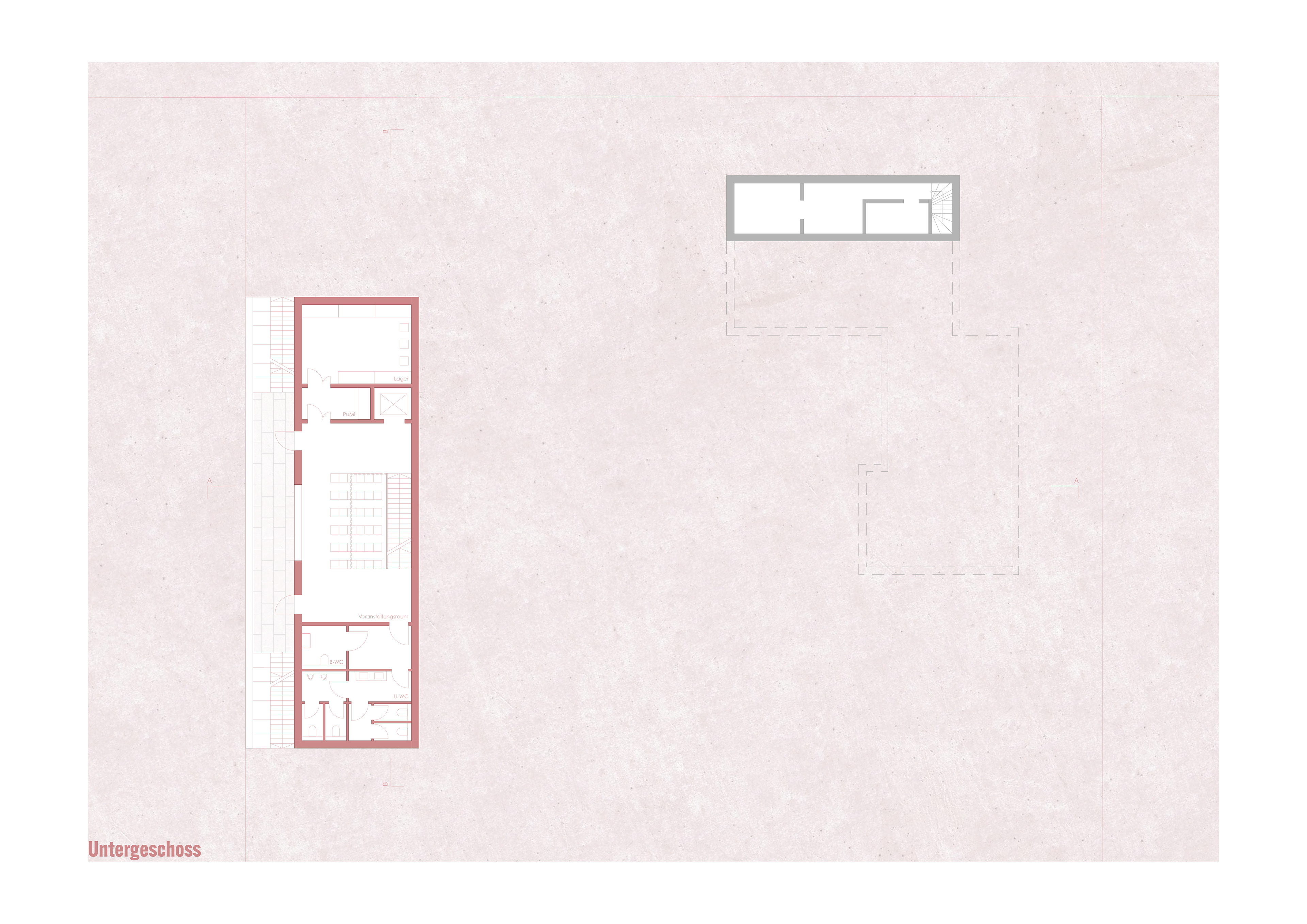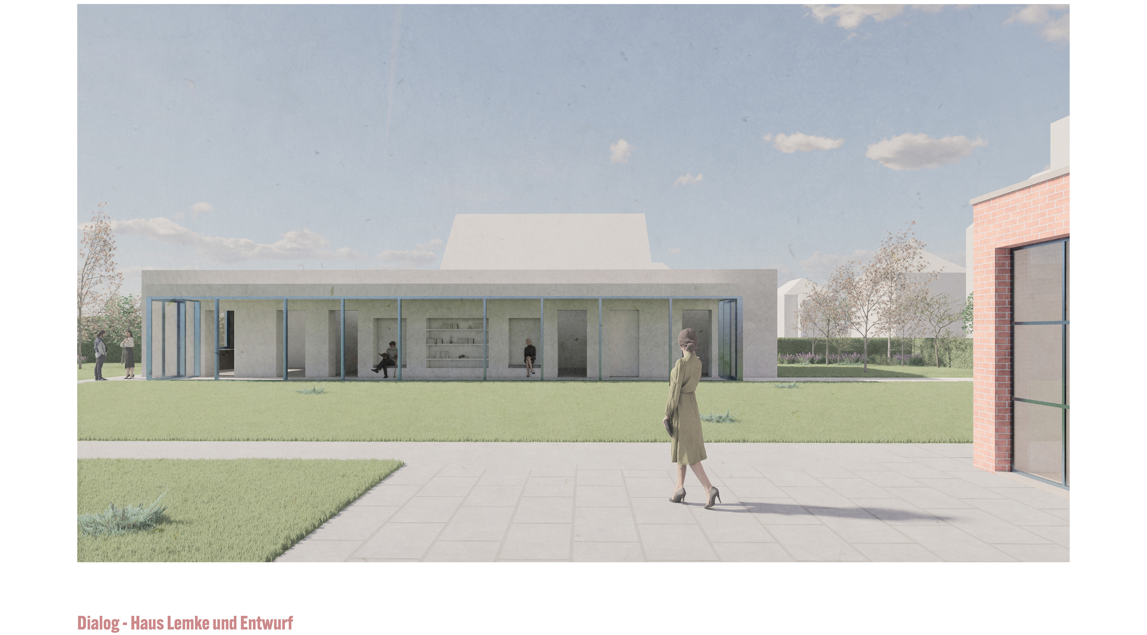 Der Entwurf versteht sich als Erweiterung des Mies van der Rohe Hauses, dem Haus Lemke und formuliert einen räumlichen Dialog zwischen Bestand und Neubau. Ziel ist es, mit dem Bestand nicht zu konkurrieren, sondern durch eine klare Ordnung und eine bewusste Setzung zu ergänzen. Zwischen dem Haus Lemke und dem neuen Baukörper wird ein verglaster Zwischenraum ausgebildet. Er fungiert als Schwelle und verbindendes Element zwischen Alt und Neu. Ein gepflasterter Weg führt von der Straße direkt auf den Eingang im Lichtgang zu und wird als Bodenbelag konsequent in diesen hinein fortgeführt. Dadurch bleibt der Lichtgang als Außenraum lesbar und verstärkt seinen Charakter als Zwischenzone. Der Hauptbaukörper ist als schlichter Riegel aus Sichtbeton ausgebildet und tritt in Kubatur & Materialität bewusst zurück. Die blauen Fensterrahmen nehmen Bezug auf die Farbigkeit des Hauses Lemke. Ein zentrales Element des Entwurfs ist die multifunktionale Wand, die den Hauptkörper vom Lichtgang trennt und gleichzeitig beide Bereiche trägt und organisiert. Sie dient nicht nur als konstruktives Element, sondern wird als räumlich wirksames Möbel verstanden. Durch gezielt gesetzte Öffnungen erschließt sie die einzelnen Räume, integriert Sitznischen sowie einen Bereich für den Museumsshop und strukturiert den Lichtgang als Aufenthalts- und Erschließungszone. Die Erschließung erfolgt ausschließlich über den Lichtgang. Beim Verlassen jedes Raumes öffnet sich der Blick erneut auf das Haus Lemke und stellt einen direkten visuellen Dialog zwischen beiden Gebäuden her. Gleichzeitig ermöglicht die große Fensterfront des Hauses Lemke den Blick in den Lichtgang und auf die Besucherbewegung. Durch die vielseitige Nutzung des Lichtgangs wird er zu einem Ort des Beobachtens und Verweilens. Der Entwurf folgt einer klaren symmetrischen Ordnung. Die Räume an den Stirnseiten sind gleich groß, während die Dauerausstellung, der zentrale Bereich, bewusst größer ausgebildet ist, um ihre hierarchische Bedeutung zu unterstreichen. Diese Ordnung setzt sich im Untergeschoss fort. Im Erdgeschoss befinden sich im nördlichen Teil des Gebäudes befindet sich neben der Garderobe das Mitarbeiterbüro. Daran anschließend folgt die Dauerausstellung als größter Raum des Gebäudes. Den Abschluss bildet das Café mit Bezug zum Garten. Unter der Dauerausstellung liegt im Untergeschoss der Veranstaltungsraum, der über eine direkte Treppenverbindung mit ihr verknüpft ist und somit die beiden Haupträume vertikal verbindet. Nebenräume wie WCs und Lager sind im Untergeschoss verortet. Vom Veranstaltungsraum aus besteht eine Austrittsmöglichkeit in den Innenhof. Über zwei Treppen mit integrierten Sitzstufen gelangt man sowohl in Richtung Straße als auch in den Garten. Der Rundgang setzt sich damit auch im Außenraum fort. Insgesamt verfolgt der Entwurf das Ziel, einen respektvollen Dialog mit dem Haus Lemke zu führen. Die Erweiterung schafft durch Symmetrie, klare Ordnung und Sichtbezug eine stimmige Ergänzung zum Bestand.